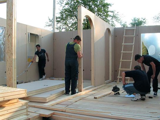 На основе фундамента было собрано деревянное нижнее перекрытие, которое стало базовой плоскостью при сборке стен первого этажа. Затем был установлен направляющий каркас здания и набраны щитовые блоки, образующие в сборке стену дома. Щитовые блоки были изготовлены в заводских условиях, что позволило достичь высокого качества при сборке дома. А чтобы не произошло взаимной подвижки щитов, их установили на бруски нижней обвязки.