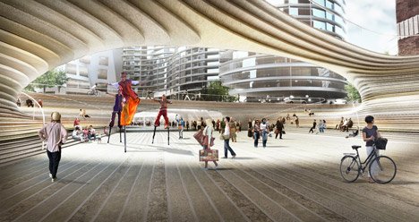 "Расположенный у самого подножия высокого символа Battersea, новая Мэлейсия-Сквер получает свою форму из человеческих потоков, создавая льющийся каскадом пейзаж," объяснил Инджелс, текущие проекты которого также включают центр посетителя Lego.